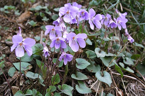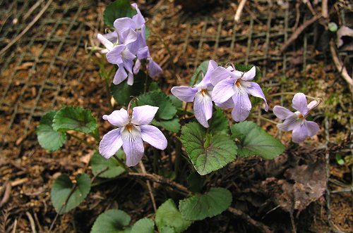 シロバナのタチツボスミレよりは個体数が多く、群落を作ることもあります。地域差もあると思いますが、比較的容易に見つけることが出来ます。 一般のタチツボスミレの葉よりやや色濃く見えるのは微細な脈にも赤色色素が入っているからだと思います。 | |