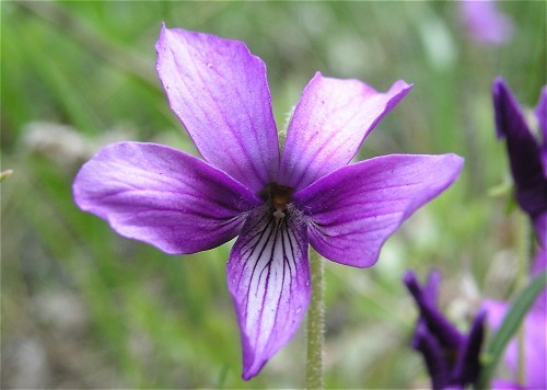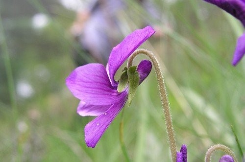 ![]() 撮影地:長野県高峯高原(2006.6.4) スミレ(マンジュリカ)×サクラスミレの交雑種。全体的に白い微毛が多くなります。 | ||