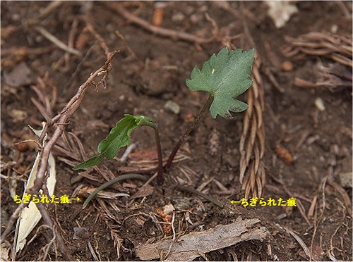 ![]() 撮影:2013.4.20 全体的に縮小か? しかし葉か花をちぎったような痕跡がありました。 |