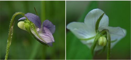 ![]() 【左】距の横からです。萼片が長く毛があるものが多いです。 【左】 深い溝があり、エゾノタチツボスミレの仲間の大きな特徴です。 |
