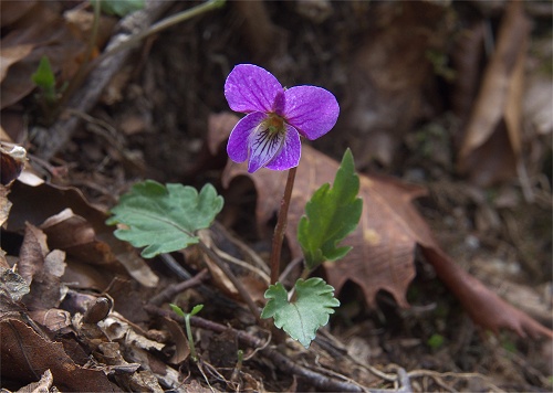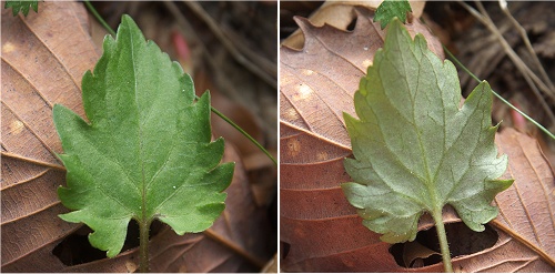 ![]() ミヤマスミレに似て全体に丸っこく卵形。切れ込みは深くないです。 花期の葉は表裏ともそれほど毛は無いですが、葉脈などには僅かに毛が見られます。 |