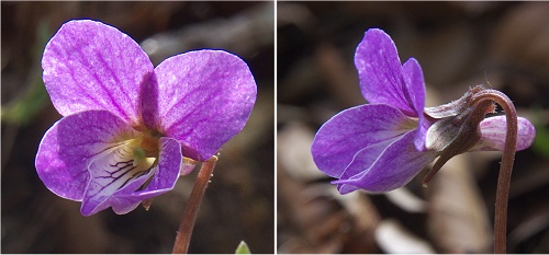 | 花の状態 | 花色 | やや白濁した紫紅色〜紫紅色。各弁にうっすら紫条が入る唇弁は白色が目立つ。花柄に微毛がある。全体的にミヤマスミレに似ている。 |