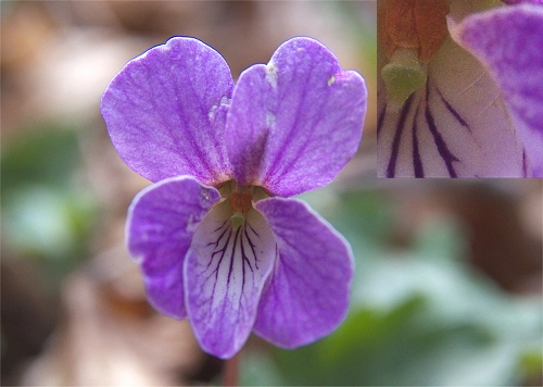 ![]() 花は全体にミヤマスミレに似ています。唇弁の白い部分が広いです。即弁には毛がありません。 |