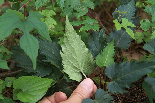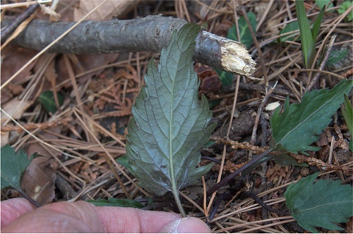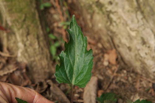 ![]() 撮影:2013.6.23 夏葉の葉裏は黄緑色になる。微毛も多い。 |