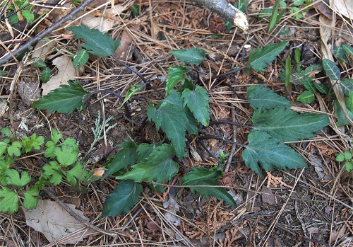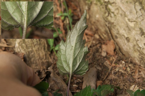 | 葉裏 | 花期の頃は淡く紫色を帯びるが次第に薄れる傾向。葉脈に沿って微毛がある。 | |