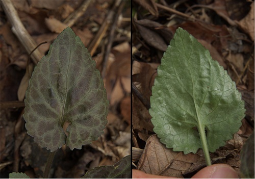 | 葉表 | 焦げ茶色〜黒紫色に脈にそって斑が入る。細かい毛がある。 | |