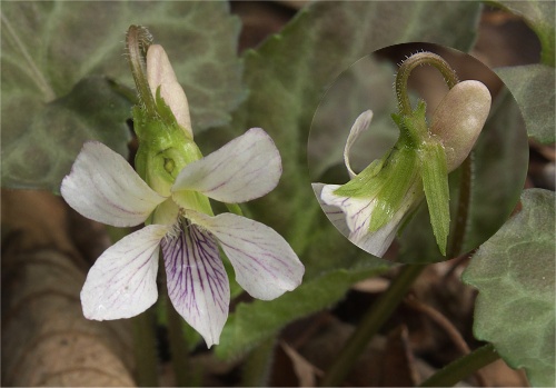 タカオスミレに斑が入った葉とでも言いましょうか。それ以外はタカオスミレやヒカゲスミレと同じです。 ここの個体は葉がまるっこく卵形をしています。またけっこう日当たりの良い場所というのも注目でしょうか。 良く見ると萼片の付属体に毛が見られるのは個体差かな? | |
