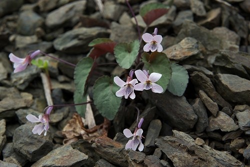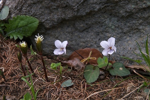 ■愛媛県で最初に発見されたので「イヨスミレ」の別名がある。 ■花柄、葉柄には極短い毛があるが、無毛に近い物も多い。 ■葉に斑の入る物は大陸産で、「フイリゲンジスミレ」と呼び外来種である。一部野生化している。 | |