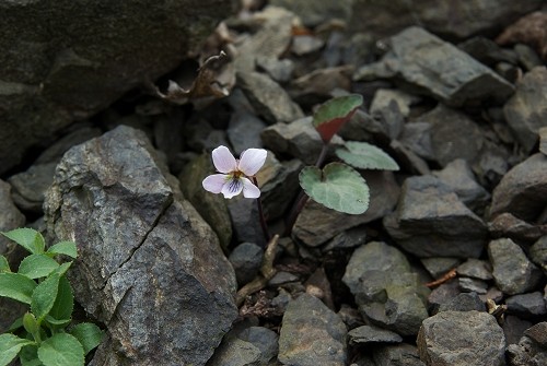 ![]() 撮影地:東京都奥多摩 2008.4.29 生育地は日当たりも良くてガレ場で崩れやすい場所でした。隔離分布しているスミレですがここの生育地はかなりの個体数です。 |