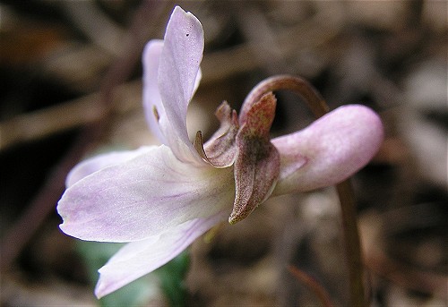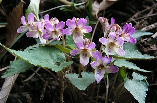 ![]() 撮影地:東京都八王子市・高尾山(2005.4) 淡いピンク色の清楚な花のスミレです。この個体は標準色のヒナスミレです。 | ||