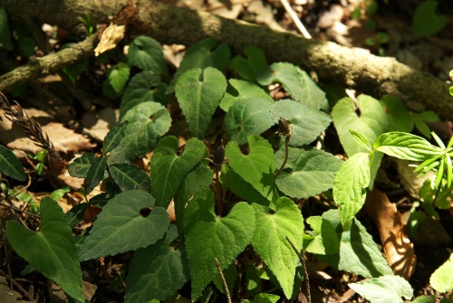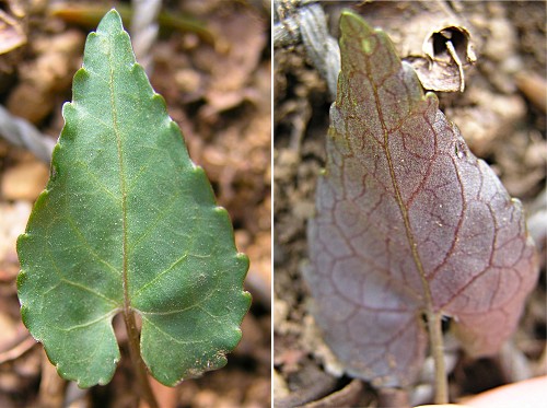 ![]() 左が表、右が裏です。葉の基部が心型になるのがポイント! 写真では解りにくいですが、普通表にも裏にも粗い毛があります。 |