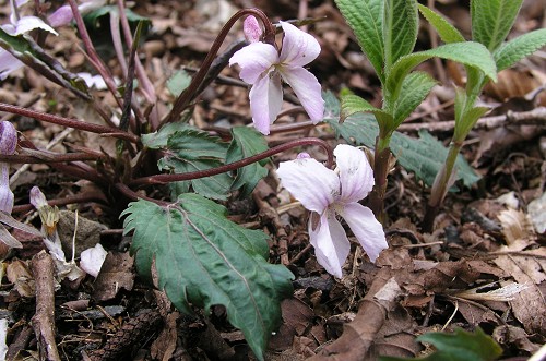 ![]() 撮影地:栃木県日光市(2006.4.30) 花はエイザンですが、葉が違うので直ぐに判別出来ます。この個体は3裂タイプです。 | ||