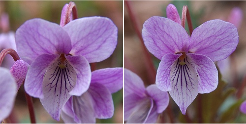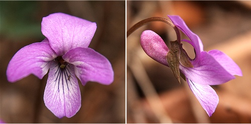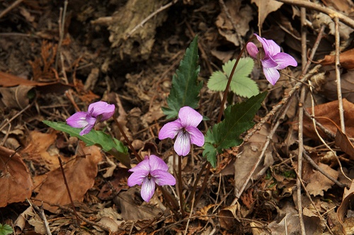 マキノ型とエイザン型に別れることが多く、マキノ型になると葉の裏面にはっきりと紫色が帯びる。やや直立するものが多い。 エイザンが混じると菊葉状になるがカワギシスミレはあまり深裂しないもことが多い。 オクタマスミレに比べ葉質がやや堅めになるのもポイントのひとつだ。 | |