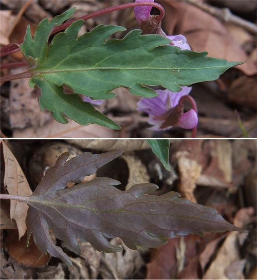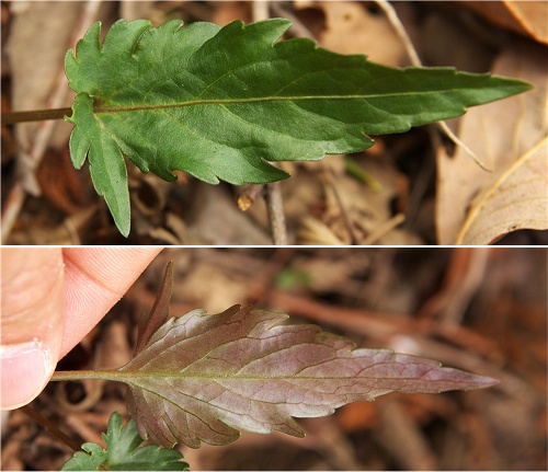 | 葉裏 | 紫色を帯びる。ほとんど無毛。 | |