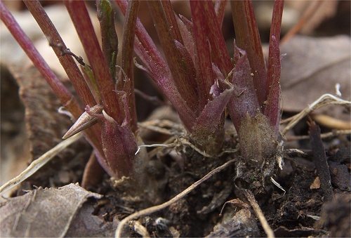 ![]() この個体は、葉の裂け方がマキノ型に比べて粗く深い。そして葉は水平からやや上方に伸びる点でエイイザン型としました。 【撮影:2014.4.19 東京都奥多摩】 |