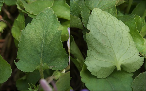 ![]() 根元に近い葉(左)と最上部の葉(右)。いづれも花期のものですが上部の葉は長く葉先が尖る傾向です。 |