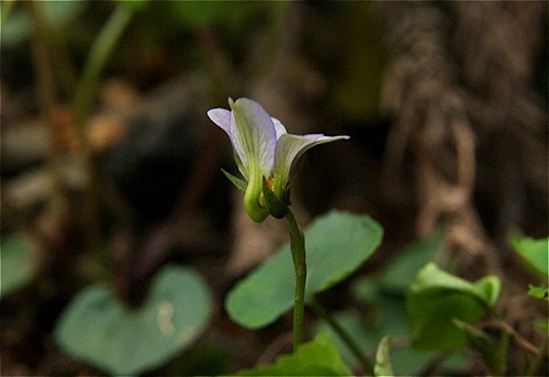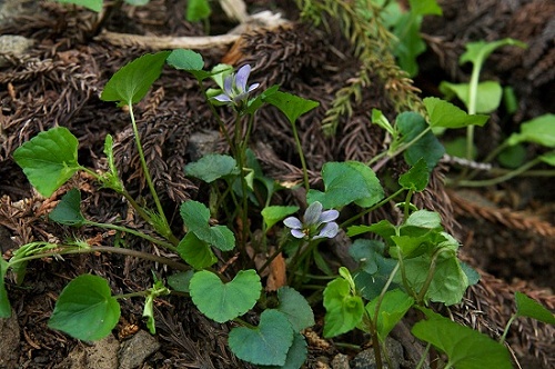 ミドリタチツボスミレは、先祖返りとも言われていまして、花は歪で基本的に上向きになるようです。名前の通り緑色になるものが多いですが、奥多摩で見つけたものは淡い紫色を帯びていました。また近くには同じ個体がいくつか見つかり