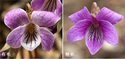 ![]() フモトスミレの白が混じったような花色の個体が多いです。側弁にはフモトスミレの特徴が出て有毛。 【右は無毛のタイプ。2014.4.29 奥武蔵で撮影】 |