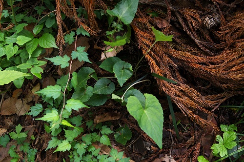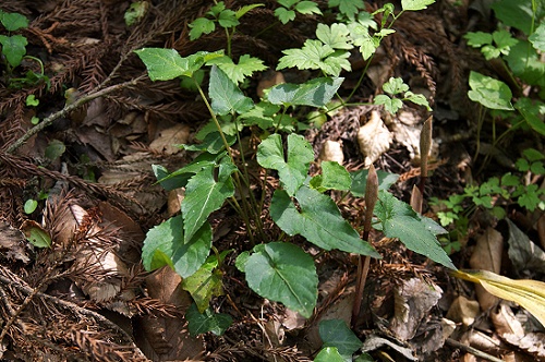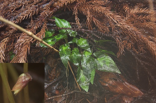 ![]() 2010.6.6撮影 個体Aの花後1月後くらいの株の状態です。花期の葉はほぼそのままの状態で残り、夏葉が出てました。しかもやや形態が異なり基部がV字形です。 |
