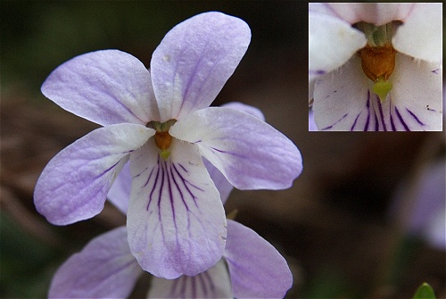 ![]() 撮影地:関東南部(2010.4.10) 見た目に雑種だと直感しました。 ヒナスミレのような清楚な色合いでした。【個体A】 | ||