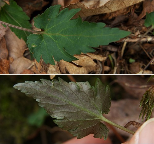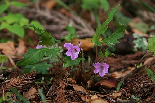 ![]() エイザンスミレの深裂する特徴とヒナスミレの葉の裏に紫色を帯びる特徴が出ます。 |