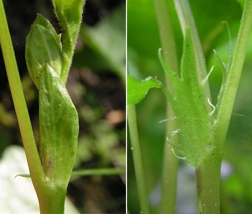 ![]() 左がオオバタチツボスミレの托葉ですが、タチツボスミレ類の特徴であるクシ型ではありません。このことからニョイスミレに近い種ではないかという見解もあります。(右はオオタチツボスミレの托葉です。) |