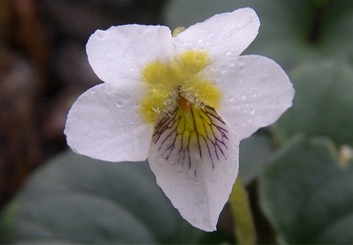 ![]() 白地に中央部は黄色という本州のスミレにはない花色です。側弁には短い毛があります。 |