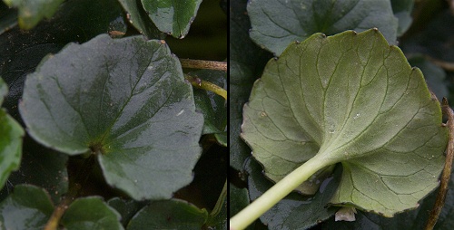 ![]() 葉は厚く、ちょっと光沢があります。 葉の表は暗緑色。裏は淡い緑色。 両面とも毛は無い。 |