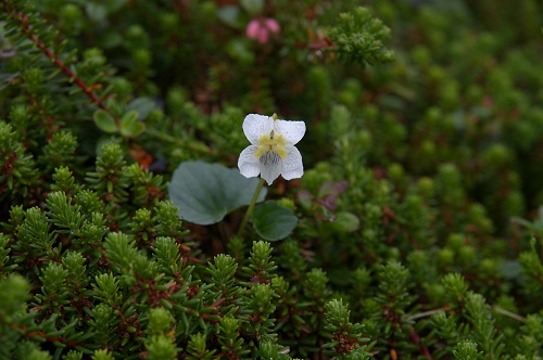 ![]() 2012.7.7 ザレ場に咲くシレトコスミレのイメージが強いですが、この個体はガンコウランの絨毯の中にぽつんと咲いていました。とても印象深い様子ですね。なんだか温々しているように見えます。 |