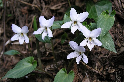 ![]() 撮影地:東京都八王子市・高尾山(2005.4) ナガバノスミレサイシンが多い山域では白花も多く見つかることがある。高尾山でも比較的多く見ることが出来ます。 | ||