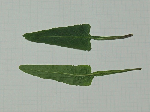 ![]() 左が表、右が裏です。ヘラ型で葉柄にははっきりとした翼(○で囲んだ部分)があります。 |