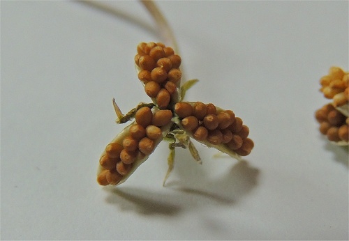![]() 果実は熟すと3つに割れてそれぞれに種がびっしりとついています。さらに乾燥すると収縮して押し出されるように種がはじき飛ばされる仕組みです。 |