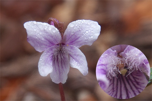 ![]() フモトスミレを大きくしたような花の形。側弁には毛が多い。 |