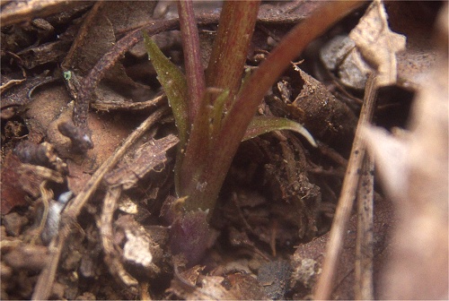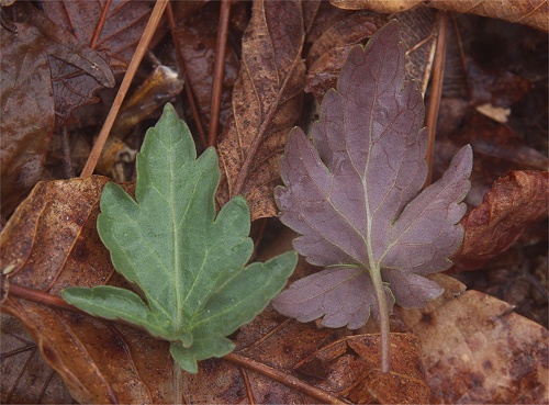 ![]() 葉表面がやや白っぽく見えるのは微毛があるため。裏面は紫色を帯びる。 |