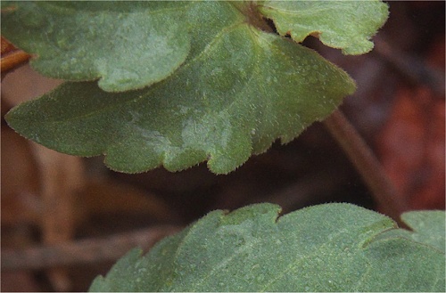 ![]() 葉表面を拡大すると細かい毛が沢山あることがわかります。縁や脈にもあります。 |
