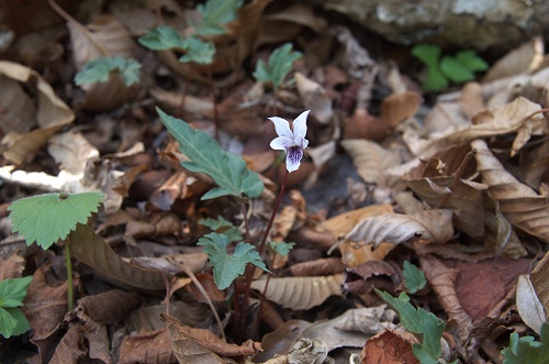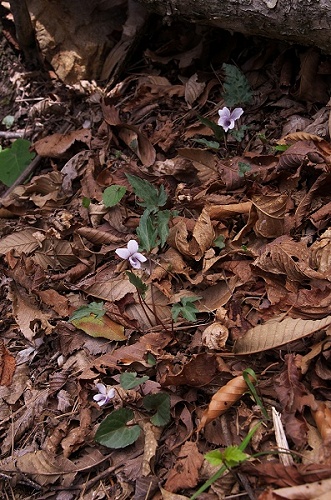 2014年、探し求めていた雑種に遂にご対面、花は1輪でしたがとても嬉しい瞬間でした。 この個体の周辺には沢山の株があり将来も有望です。 付近のフモトスミレは葉の表面が白っぽくもしかしたら斑の可能性もあるのですが明瞭でもないのでスルガキクバスミレとするのが妥当と同定しました。 ■根や根茎で増えることが判っています。このためしばし小群生を作ることがあります。 | |