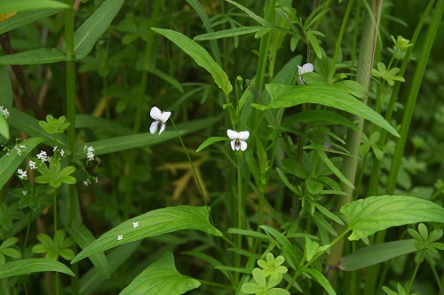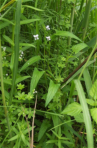 ニョイスミレの仲間ですがどちらかというとタデスミレに似た雰囲気があります。 河川開発で絶滅の危機に瀕していますが、一部地域では葦原の野焼きなどの保護活動もあって個体数を増やしています、とはいえ絶滅危惧種には 変わりはない希少なスミレです。 背丈は1mに達することもあります、これは葦の成長が大きく起因していて、葦があまり無いところでは30pくらいにしか伸びません。葦の成長に 合わせるようにタチスミレも伸びるようです。 花期が比較的長いのも葦の成長に起因すると思われます。閉鎖花はあまりつけず開放花を断続的に咲かせます。時期的に受粉の媒介になる虫には不自由 しないので咲かせる方が効率がよいのかもしれません。 | |