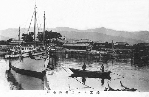 竣工がおわった出羽島港内の様子のようです。写真下にそう書かれているので間違いない でしょう。 現在のデイサービスセンターあたりから撮影したものと思います。向側に組合舎が見えています。 撮影:昭和初期