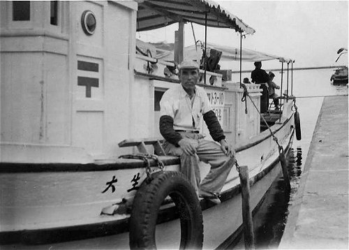 出羽島と牟岐とを結ぶ連絡船は現在就航している船で8代目で1代目就航から島人口の 増加と共に新造され大きくなってきた。この写真は5代目の木造船である。 因みに写っている人は大生丸の機関士である。 撮影:昭和初期