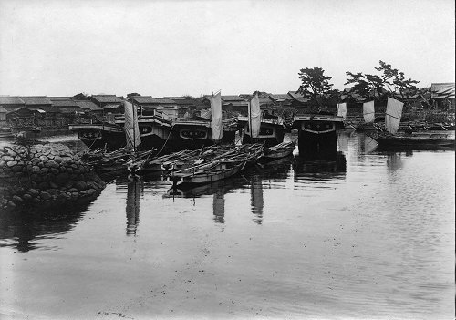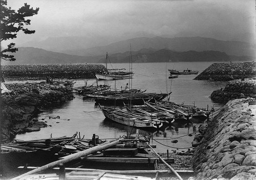 今も昔も出羽島は漁師の村ですが、当時も沢山の漁船がいたことがわかります。 殆どは帆立船ですが、動力船が台頭しつつある時代のようです。上の写真奥の船は動力船。 下の写真には沢山の動力船が5艘写っています。よく見ると船名も書かれています。 拡大して読んで見ると「蛭子丸」や「金比羅丸」といった縁起の良い名前が多いようです。 それにしても、港の岸にも大きな松の木があったのですね〜 出羽は当時から松の木が 多かったみたいです。 撮影:昭和初期