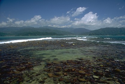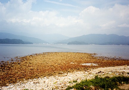 島の北西海岸には州の鼻と呼ばれる浅瀬がある。99%が大小の石で構成され る。海底地形図を見ると対岸まで水深10〜15m以内の浅瀬として伸びてお り太古の昔は対岸まで繋がる半島だったのではないかと推測される。その後、 島の西側と東側から押し寄せる波によって浸食され現在のようになったのでは と思うのだが・・・ 写真のように潮が引くと石の浜が姿を現す。石の間には僅かな砂が堆積してお り昔はアサリが沢山いたものだ。砂は大半が貝殻の破片なのが面白い。