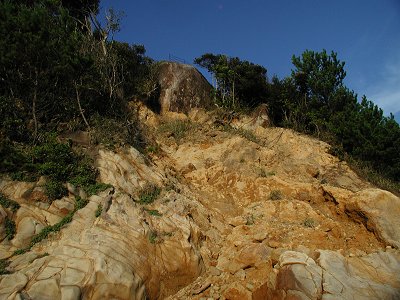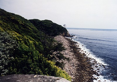 牟岐町や出羽島を歩いた野口雨情が作った詩の中に「船で廻れば出羽島一里 島にゃ大池蛇の枕」という一節がある。その蛇の枕がこの場所にある岩である。 それほど大きくはないのだが、その昔、大池に住む大蛇がこの岩を枕にして昼 寝をしていたという伝説があったそうな。それで蛇の枕と云うらしい。これ程 の岩を枕にする大蛇とはいったいどのくらいなのか? 一説には一抱えくらい の胴回りがあったという。しかも、その大蛇伝説は時代を変えて目撃談がある らしく、大昔には本当に大蛇が住んでいたのではないかと思われる。実際出羽 の蛇は大きいのが多いのだ!! 近年この蛇の枕の脇に展望あずま屋が出来ている。ここからの眺めは絶品で あると同時にかなり怖い。 しかし、海側の崖が大規模に崩れてきており近い将来には蛇の枕自体も崩れ 落ちる可能性が高くなってきている。崩壊防止工事も難しくこのまま崩れさる のが運命のようだ・・・ |