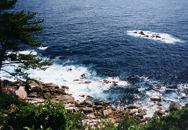 昔、豊漁が続いた時代には出羽島周辺にはクジラやイルカ、カジキマグロ等 といった外洋性の魚たちが回遊してきた、そんな時代には小魚を追ってアシカ といった海獣も姿を見せていたそうだ、そのアシカがよく休んでいた岩という ことでアシカバエと名付けられたそうな。現在は潮の流れがまったく変わって しまって回遊魚の姿もなくなってしまった。何かの原因で潮が変わり豊漁の海 になればまたアシカの姿を見ることが出来るかもしれない。このアシカバエは 西側の灯台に通じる道沿いから見ることが出来ます。 (写真右上の岩がアシカバエです。) |