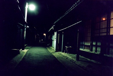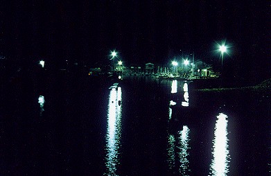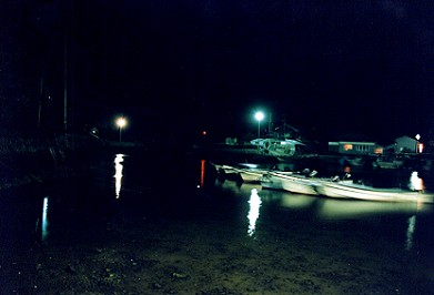 昼間でもひっそりとする出羽島だが夜になるともっとひっそりしてくる。漁 村ということも手伝って家の明かりが消えるのがやたらに早くてだいたい9時 には大概の家は消灯する。お年寄りが多いせいもあるのだが・・・このお陰で 夜はやたらめったに静かで都会の喧噪に慣れた人が訪れればびっくりすること だろう。上の写真はスバナ地区の夜景だ。