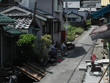 出羽島は漁師町、早朝に漁に出てお昼ころには殆どの船は戻ってくる。 午後になると軒先の日陰で漁具の手入れをする光景を良く目にする。 漁師町らしい光景で風情がある。