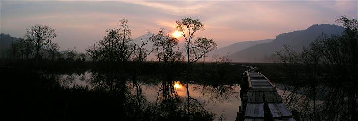 上田代と中田代の境を流れる上の大堀川の袂から日の出の頃を狙ってみました。強い春霞と薄雲が朝日を