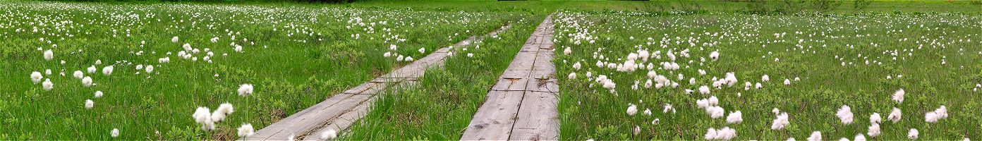 ■ワタスゲの大群落/尾瀬ヶ原・竜宮十字路付近(2003年6月27日撮影) 2003年は例年になくワタスゲの当たり年となった。尾瀬ヶ原全域や大江湿原で大群落が見られ白い絨毯 のように湿原を染めていた。 竜宮十字路付近のワタスゲも見事で、木道に座って見ると密度が濃くなり見応え十分な風景が見られる。 座った視線で見るワタスゲの群落、とくとご覧あれ〜 |