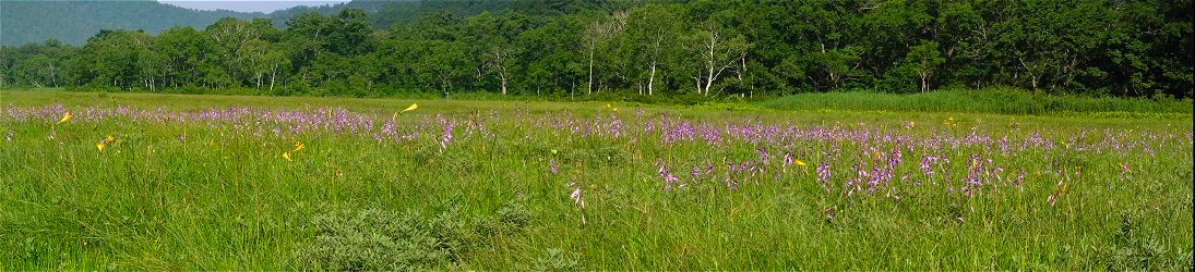 尾瀬ヶ原の三つ又からヨッピ橋方向に少し歩くと一面紫色の花に覆われていた。例年この時期に咲くコバキボウシ