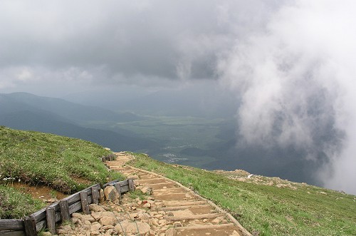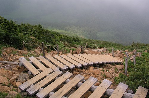 【高天が原〜中腹ベンチ】 木製の階段でやや高度感ありますが尾瀬ヶ原が真下に見える感じで展望も宜しい。但し、斜度がきついところや傾いている箇所もあり特に下りでは注意が必要です。ベンチまでは高山植物が多いです。 |