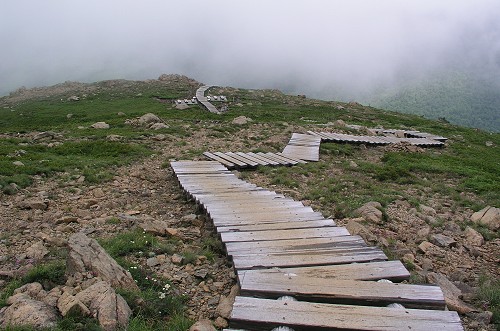 【山頂直下〜高天が原】 木製の階段が続きます。展望もよく快適。高山植物も沢山あり撮影に熱が入ります。 |